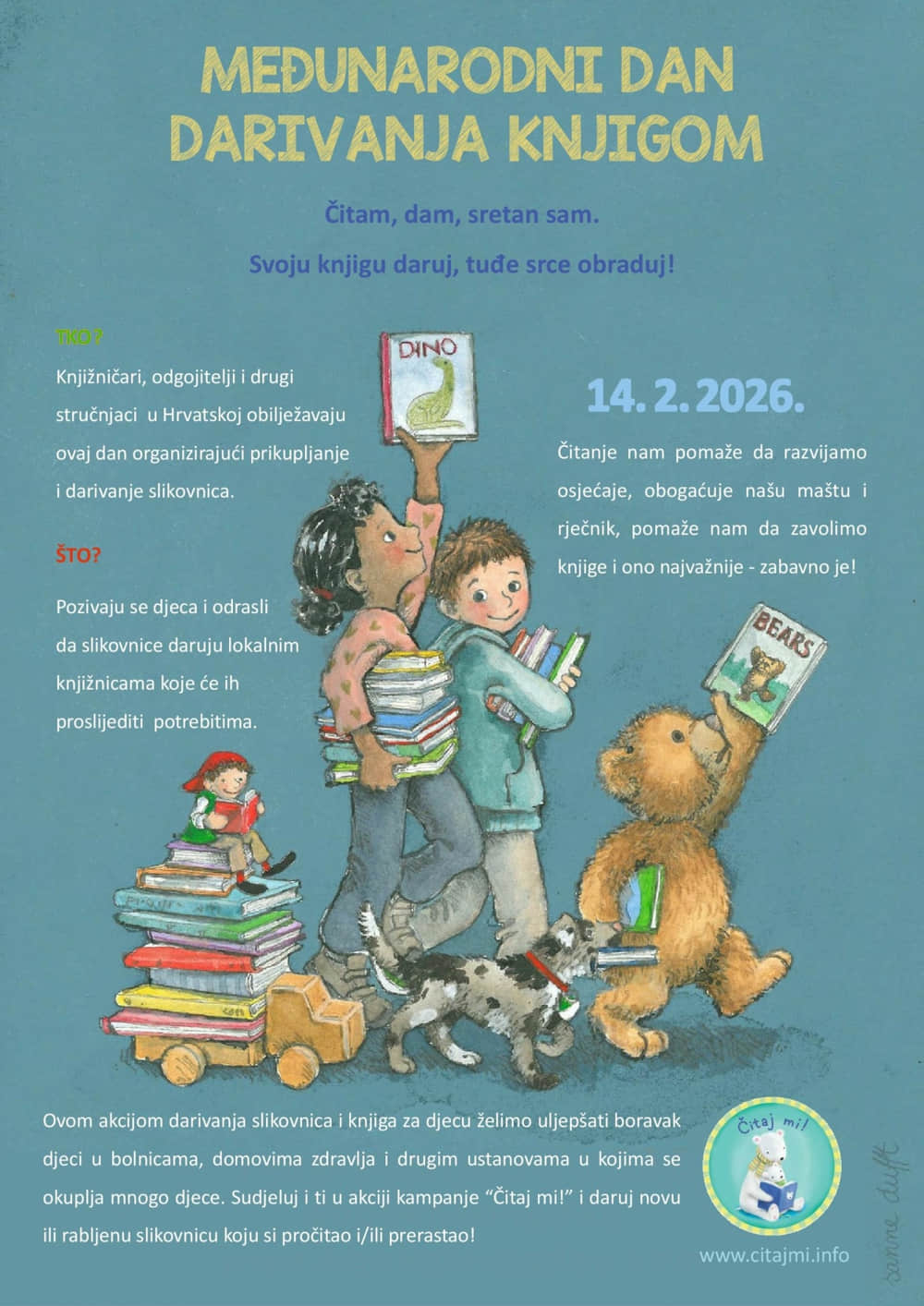 Svoju knjigu daruj, tuđe srce obraduj!Pozivaju se djeca i odrasli da slikovnice i knjige koje su prerasli/pročitali daruju lokalnim knjižnicama koje će ih proslijediti potrebitima.